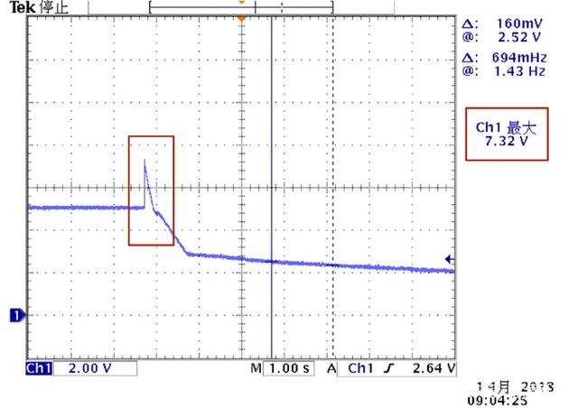 Observe the oscilloscope and you will see The output voltage will first rise and then fall. The overvoltage point of the following power supply is 7.32V.