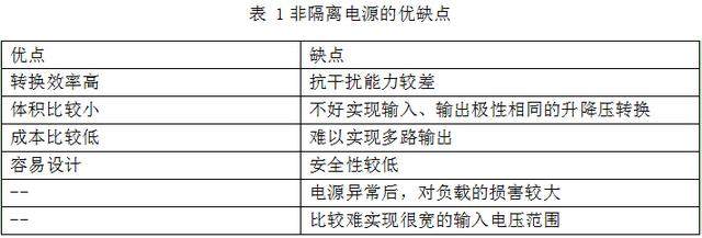 Combining commonly used isolated and non-isolated power supplies, we can intuitively draw some of their advantages and disadvantages, as shown in Table 1 and Table 2, the advantages The disadvantages are pretty much the opposite.