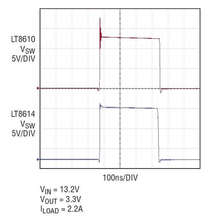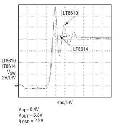 Figure 4. Switch node rise of LT8614 Silent Switcher and LT8610 Comparison along the edges.