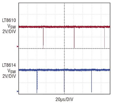 In the time domain, the LT8614 performs well at the edge of the switch node, as shown in Figures 4 and 5. Even at 4ns/div, the LT8614 regulator has very little ringing. As shown in Figure 4, the LT8610 has good ringing rejection in comparison, but it can be seen to store more energy in the hot loop compared to the LT8614 (Figure 4).