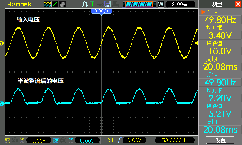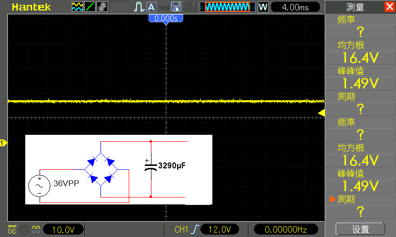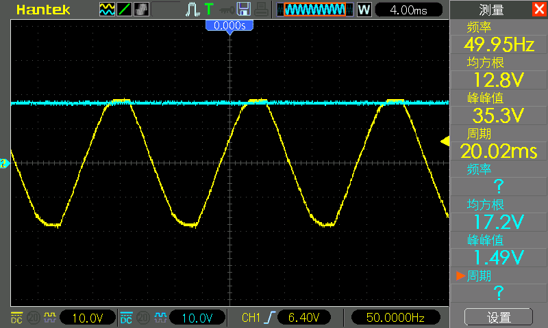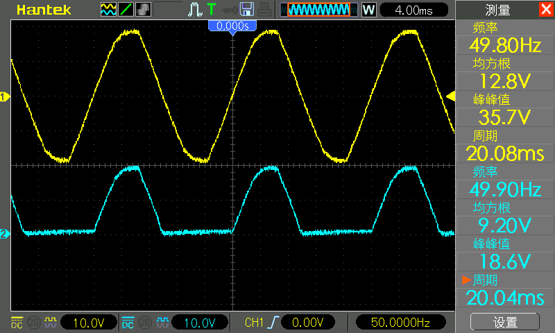 This is a bridge finisher built by the author using four 1N4007 diodes, inputting the 12V output of the transformer, note that I used a 4.7k resistor as the load. Because there is no capacitor filtering at this time, if the output waveform is directly measured without connecting to the load, there will be deformation: