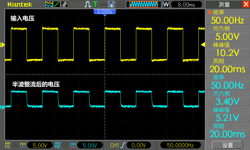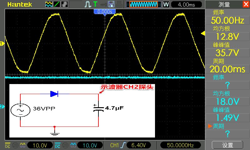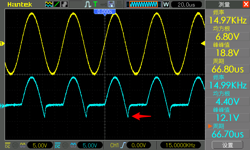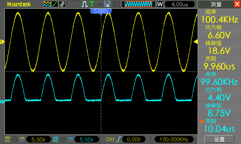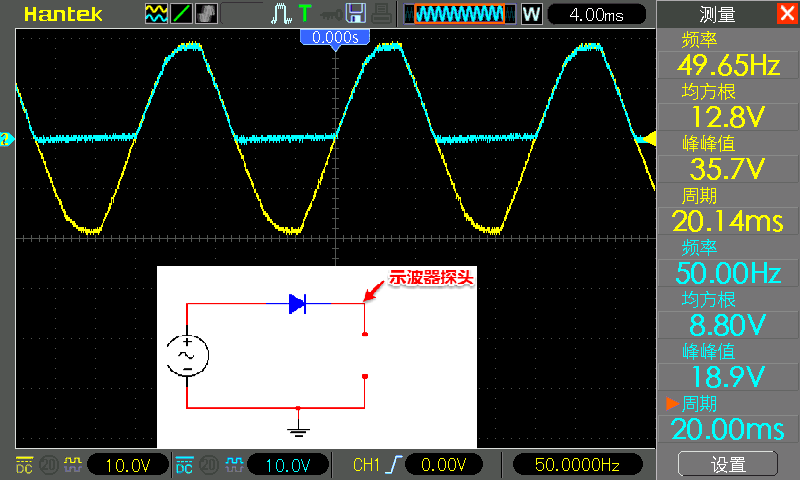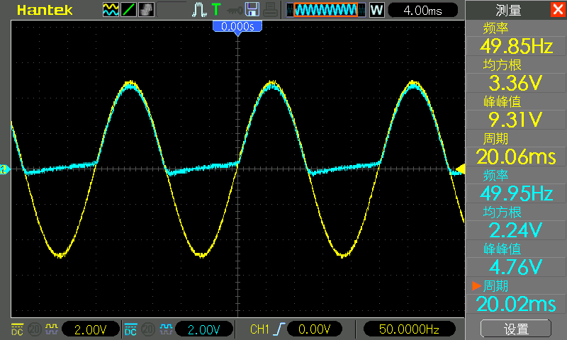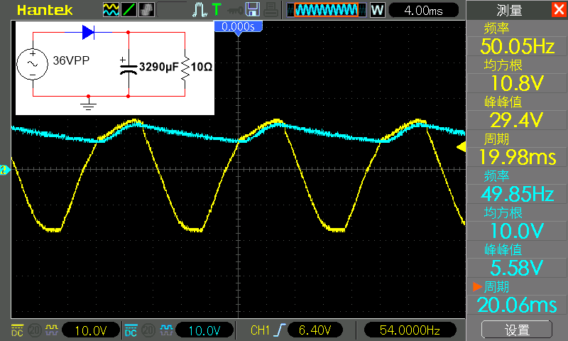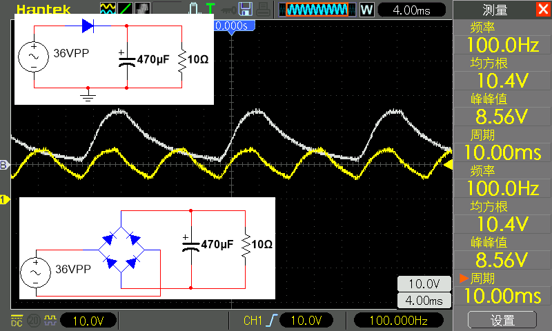 The CH1 probe is still connected to the positive pole of the diode, and the CH2 probe is still connected to the negative pole of the diode. In the figure below, CH1 is yellow and CH2 is blue.