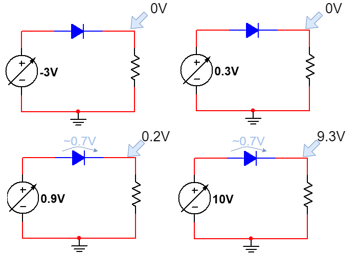 When the input voltage is 0.9 volts, the diode conducts, but due to the forward voltage drop, the voltage at the output is 0.2 volts.