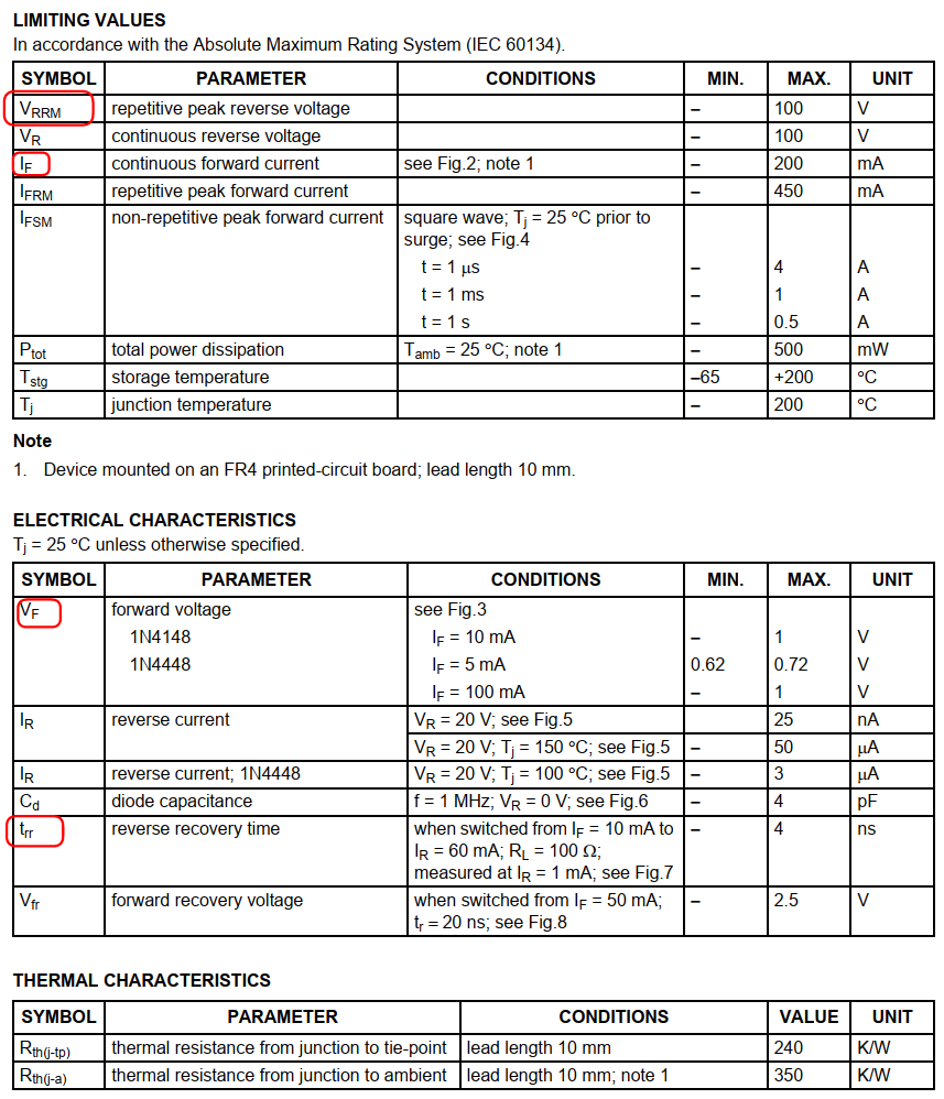 The last parameter worth noting about diodes is: switching speed. In the document, this parameter is generally written as Reverse Recovery Time in the electrical parameters (ELECTRICAL CHARACTERISTICS), and the symbol is: trr.