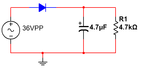 We add a 4.7 microfarad capacitor after the diode, and immediately output a perfect voltage of 18 volts DC:
