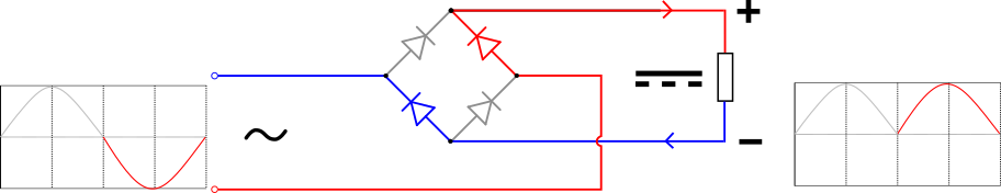 Now in the second half of the sine wave, the input connected to the left of the diamond is negative (blue), the input connected to the right of the diamond is positive (red), and the current flows from the lower terminal along the red (positive) The path flows right to the output, returning along the blue (negative) path back to the power terminal below.
