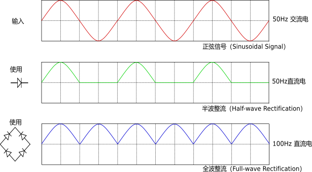 So if you feed AC into the positive terminal of the diode, the negative voltage will be blocked and you will only get the positive half of the waveform at the negative terminal of the diode. This process is called half wave rectification (Half Wave Rectification). It is also suitable for other waveforms with negative voltage, such as: square wave, triangle wave, etc.