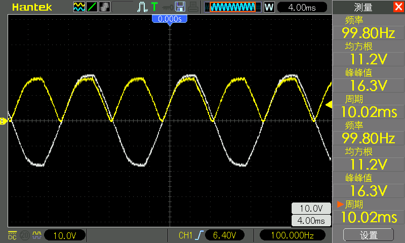 From the waveform below, you can see that the previous 50 Hz voltage has positive and negative voltages, after After rectification, it becomes a constant positive hump voltage of 100 Hz without negative voltage. This is called full wave rectification because we are rectifying a full AC wave. The white waveform is the input waveform, which is saved and displayed using the Reference Waveform function of the oscilloscope. Because there is no common ground for AC and DC at this point, it is not possible to measure both waveforms simultaneously. The rectified waveform has a peak-to-peak value of 16.3 volts and an rms value of 11.2 volts.