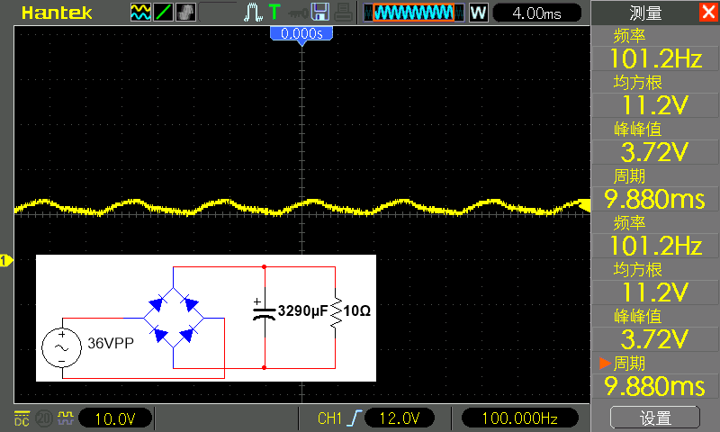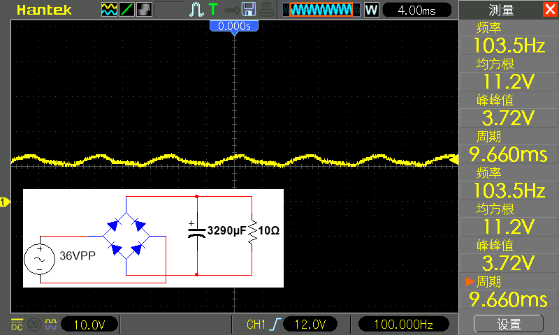 The root mean square value (which can be understood as the average value) reaches a voltage of 11.2 volts, which is higher than the 10 of the 470 microfarad filter used before volts, the power supply ripple is also reduced from 8.5 volts to 3.72 volts.