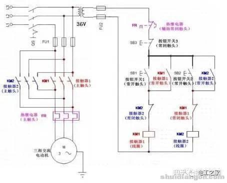 Single-phase 380V becomes 36V safe voltage after passing through the transformer, and then supplies power to the control circuit. After the 36V power supply first passes through the thermal relay and the stop switch SB3, it goes to the forward rotation button SB1, the reverse rotation button SB2 and KM1 normally open, KM2 normally open respectively.