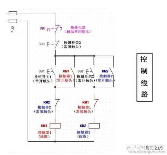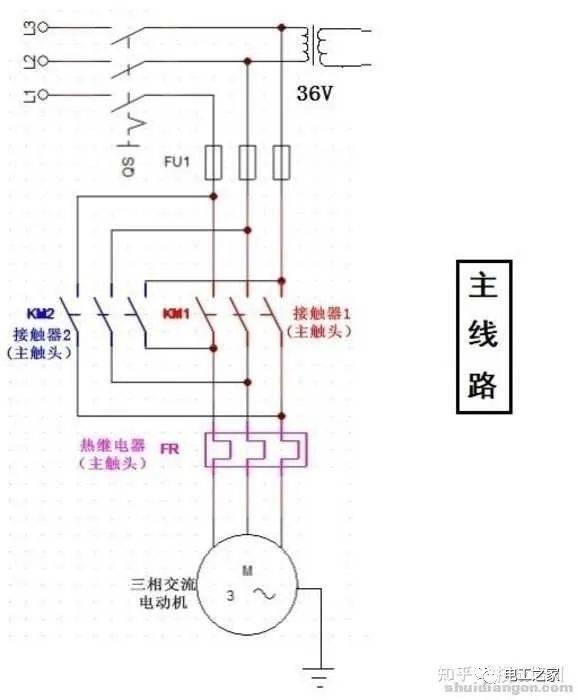 Let's take a look at the main line first. After the three-phase power supply passes through the fuse, it is divided into two circuits, which are respectively connected to the main contacts of the two contactors. At this time, the phase sequence of the contactor's main contact incoming line corresponds to the power supply one by one. The outgoing lines of the main contacts of the two contactors are exchanged and connected in parallel, then connected to the thermal relay, and finally connected to the motor.